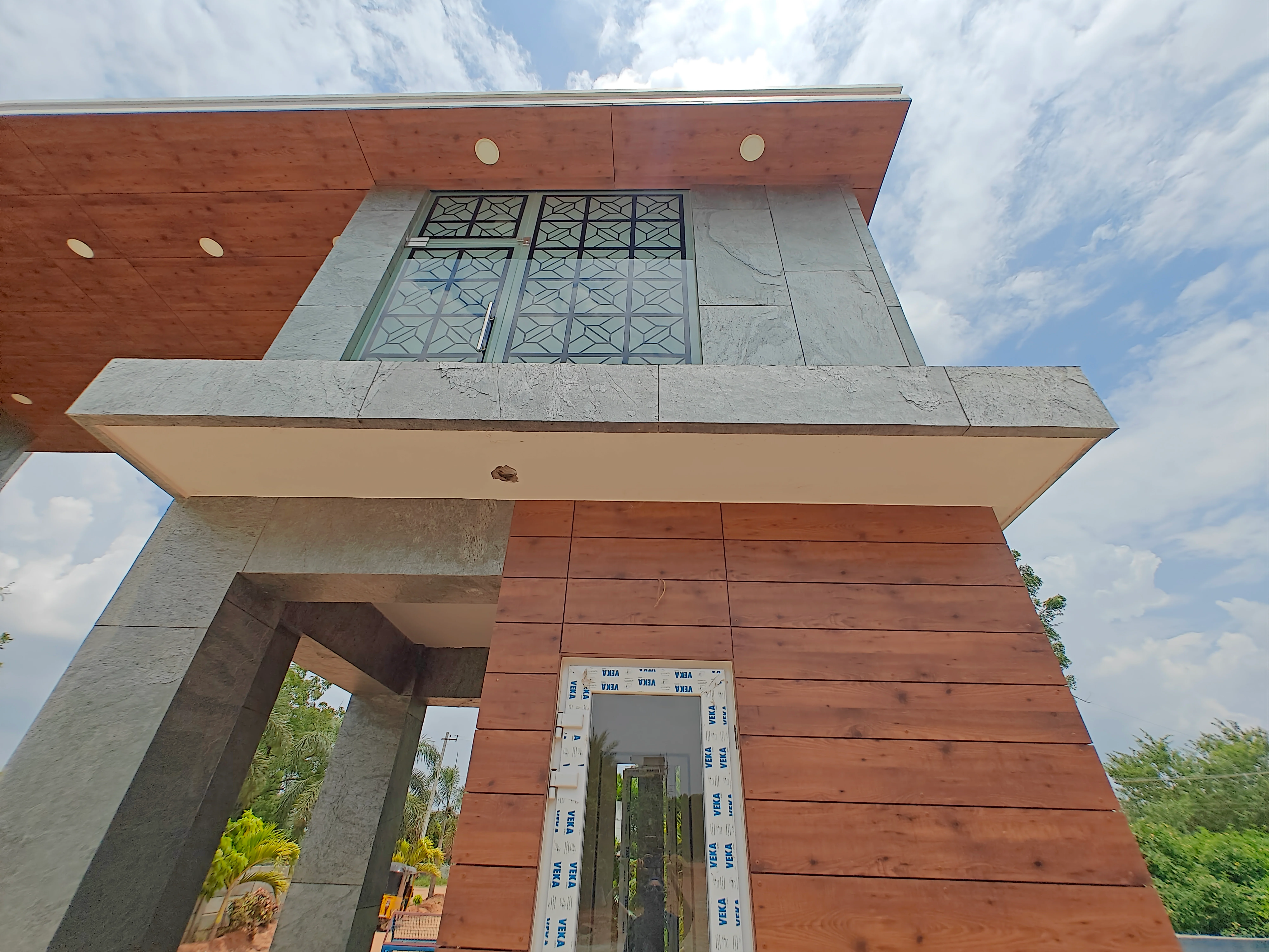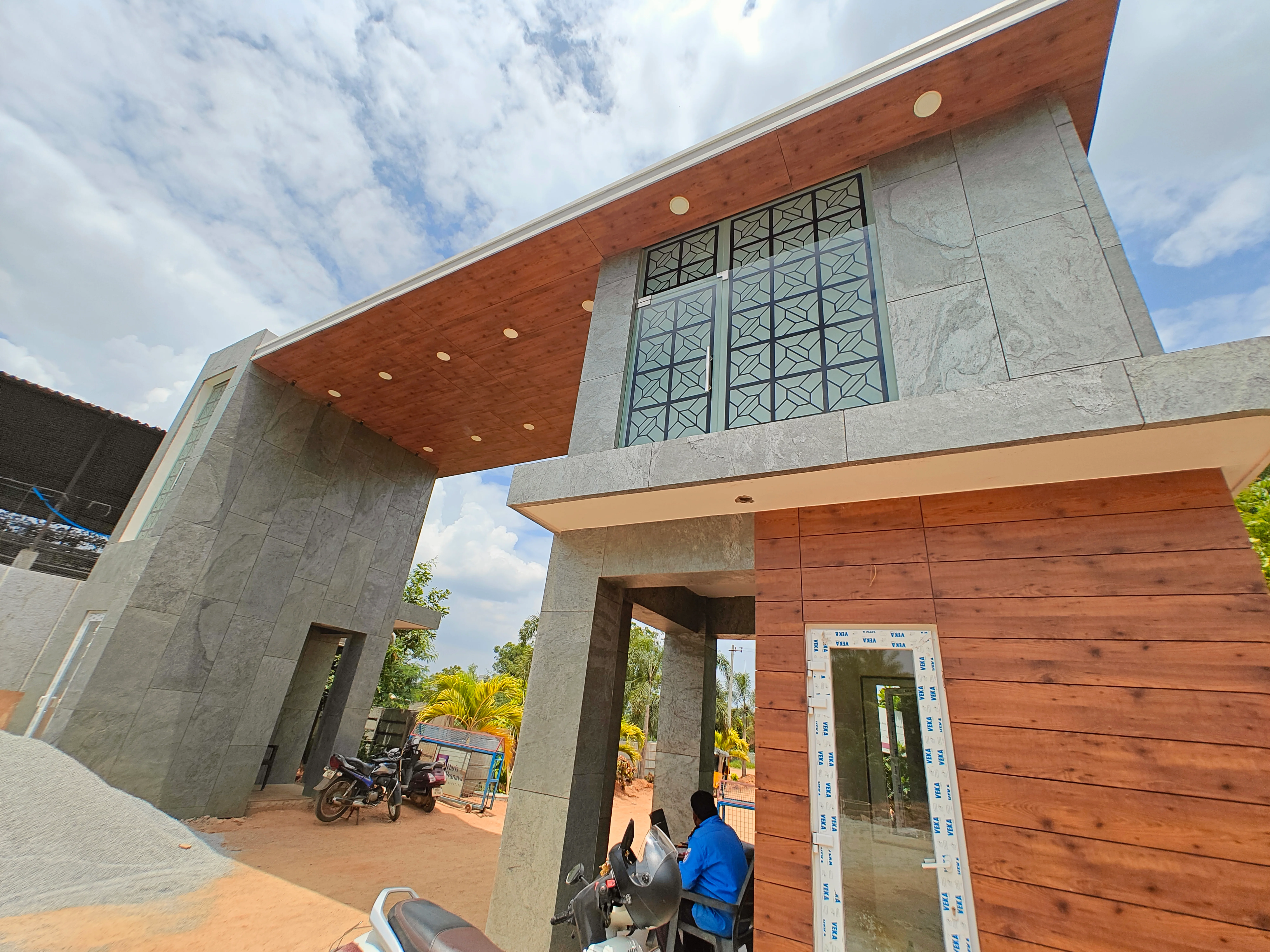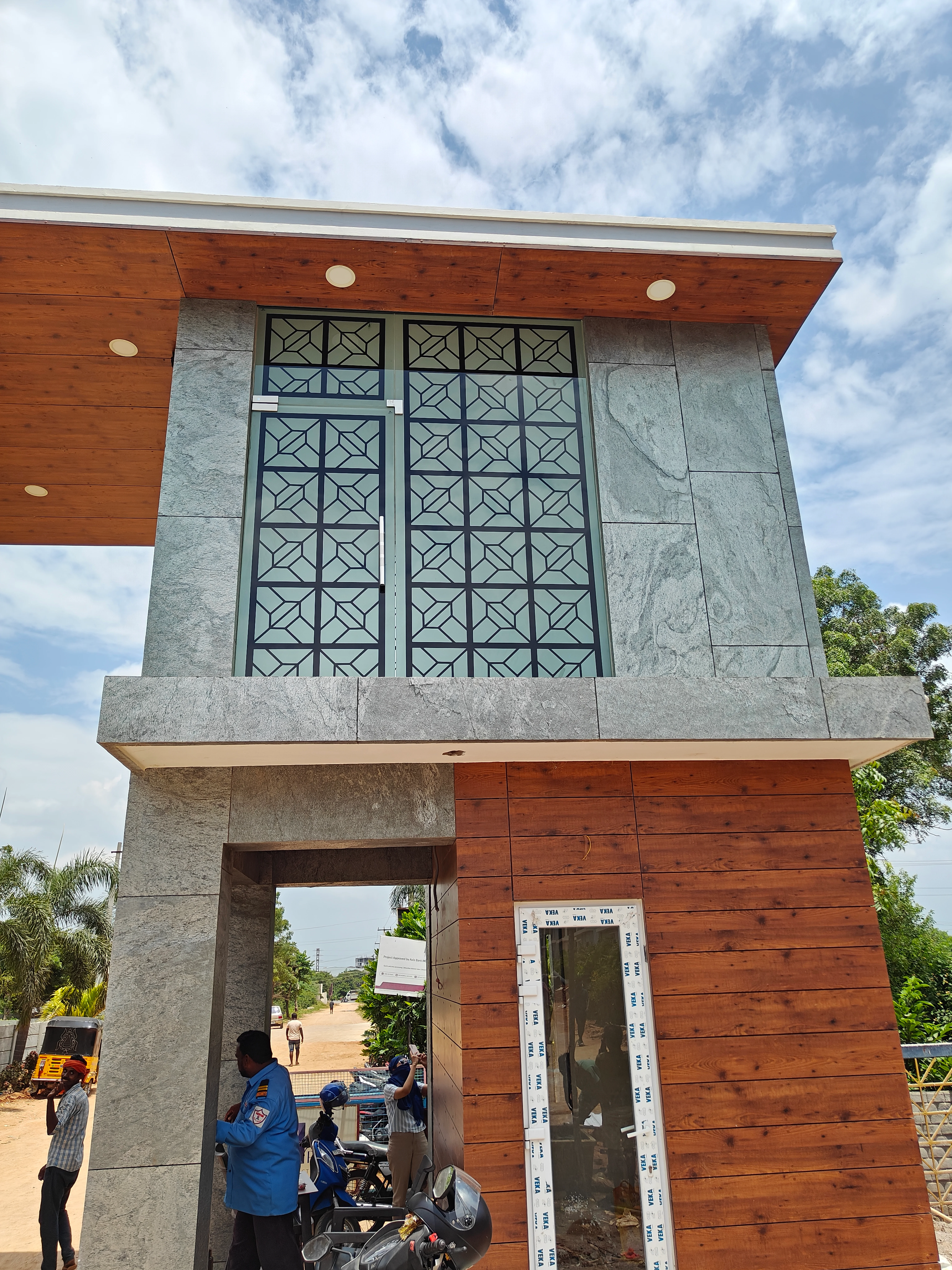 The entrance is accentuated with Quartzite Silver Shine Gold, a material known for its shimmer and elegance. The golden undertones add a luxurious feel, providing a grand welcome to visitors.