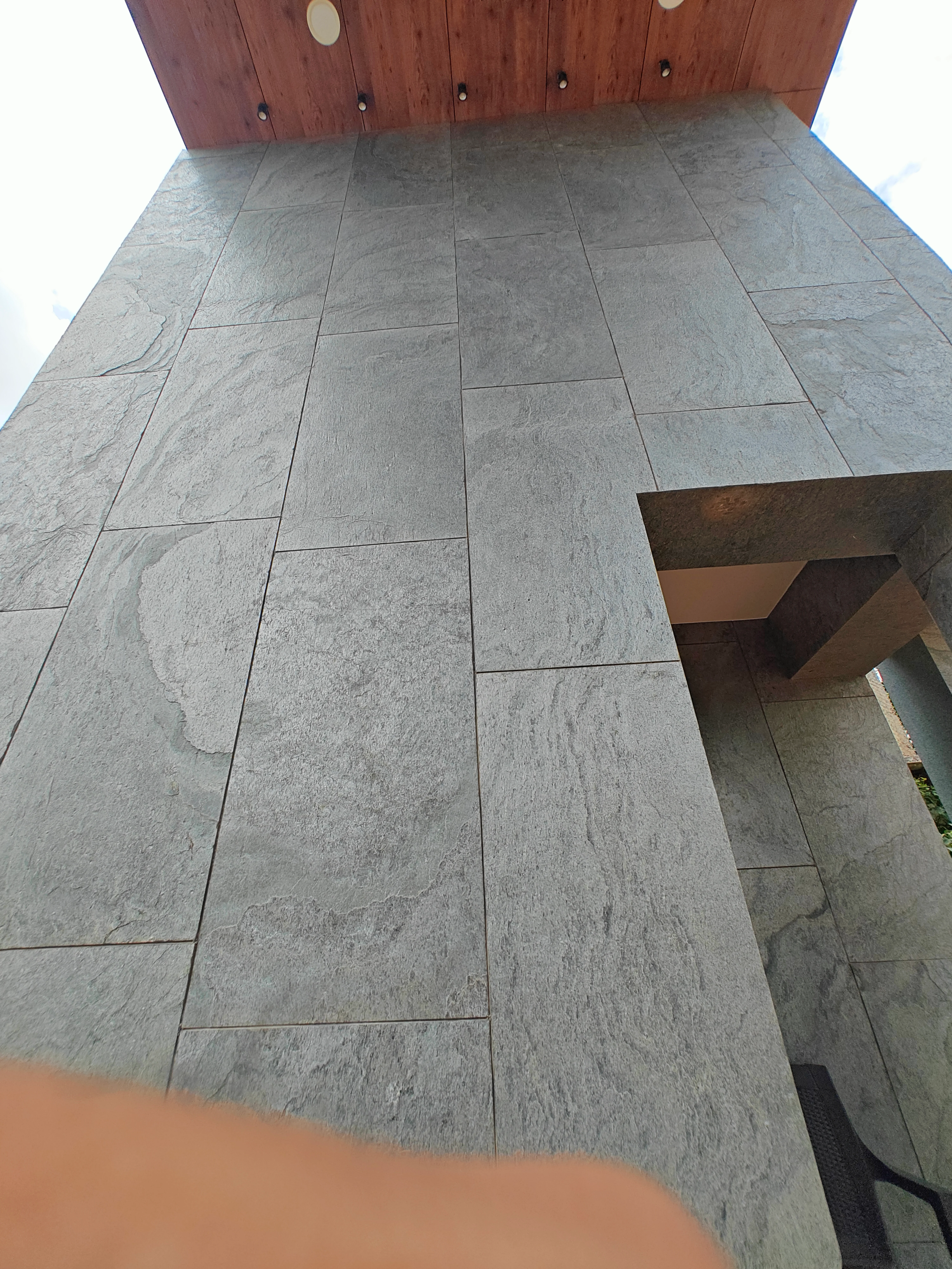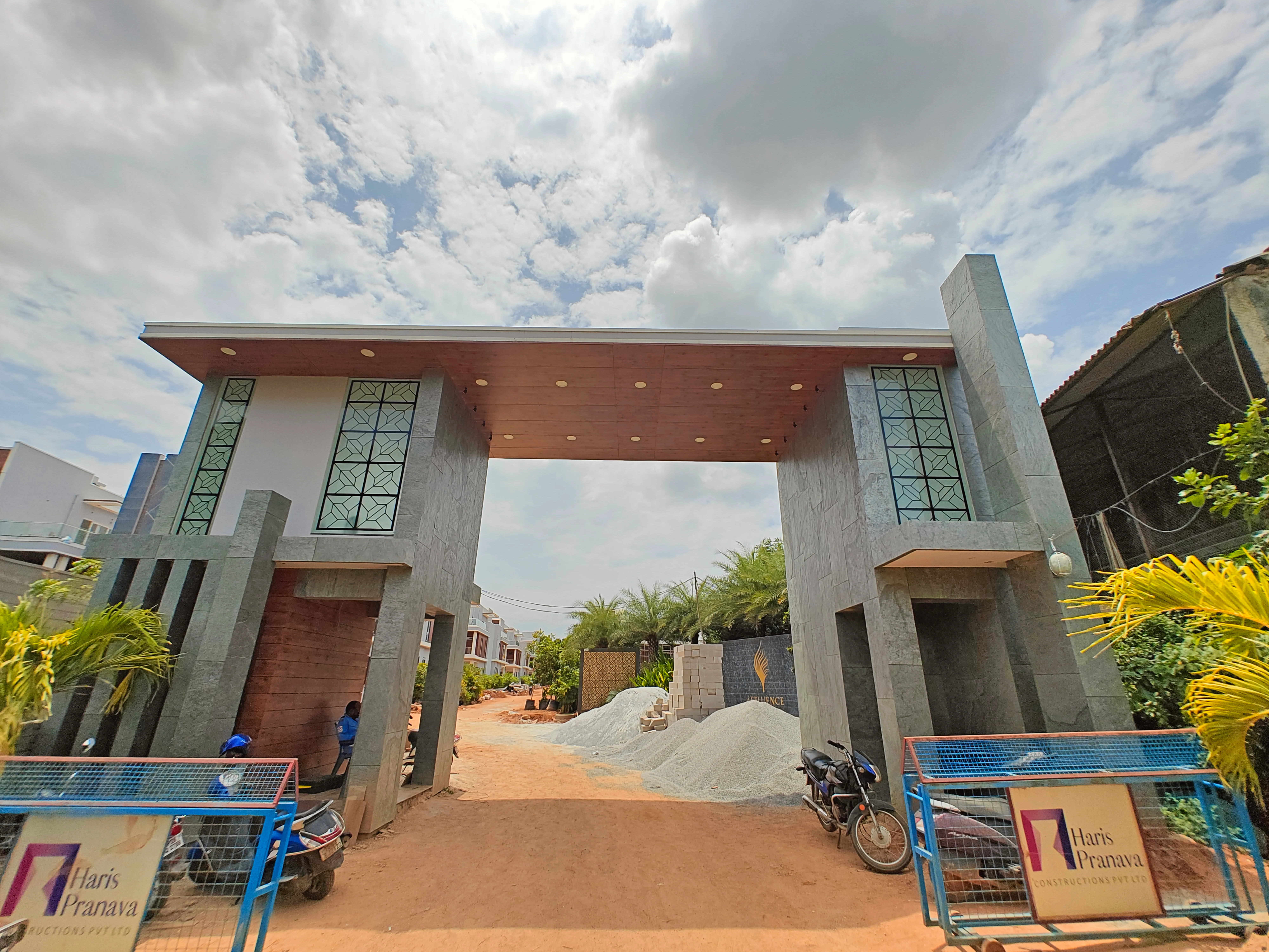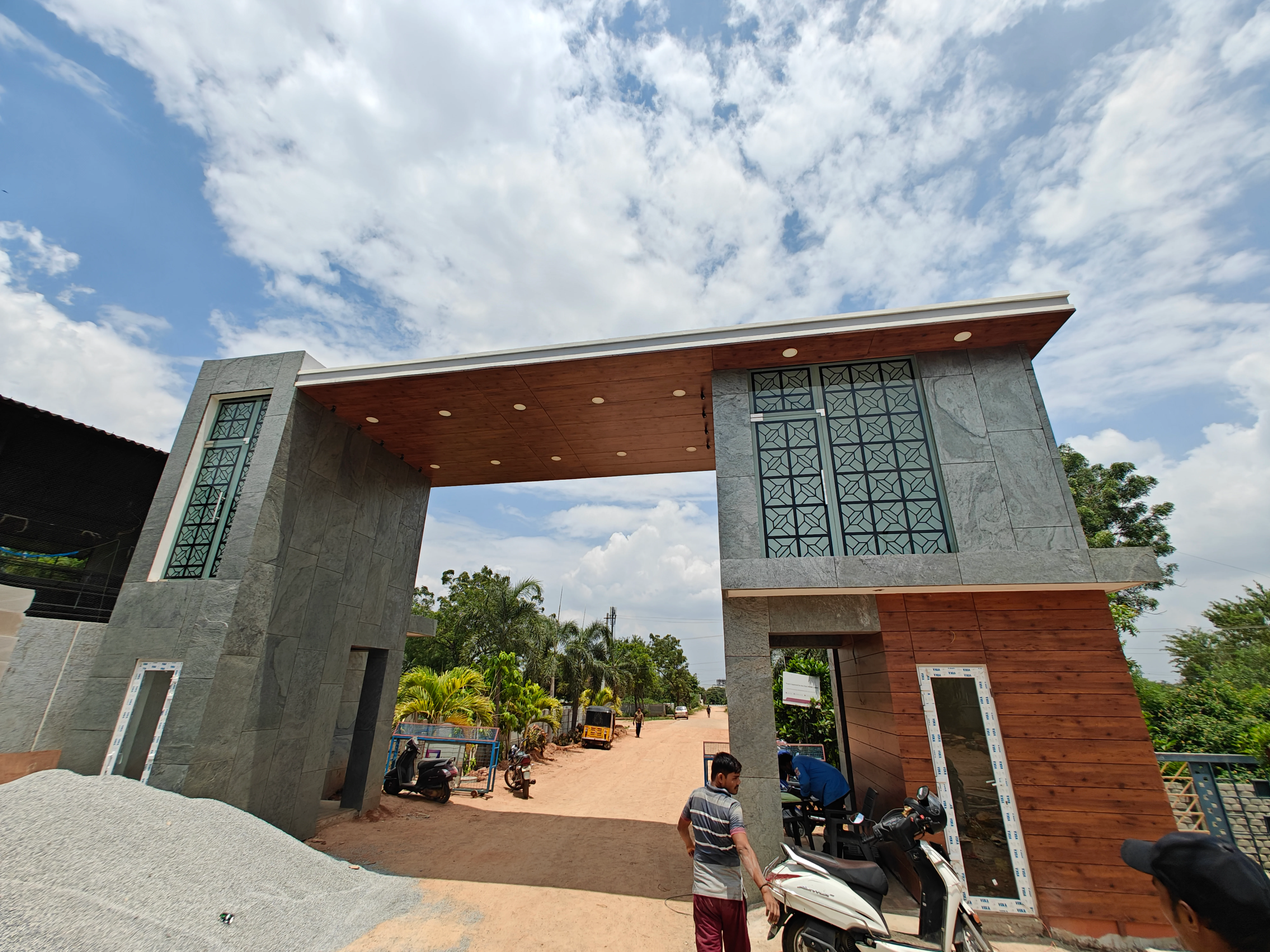 The entrance is accentuated with Quartzite Silver Shine Gold, a material known for its shimmer and elegance. The golden undertones add a luxurious feel, providing a grand welcome to visitors.